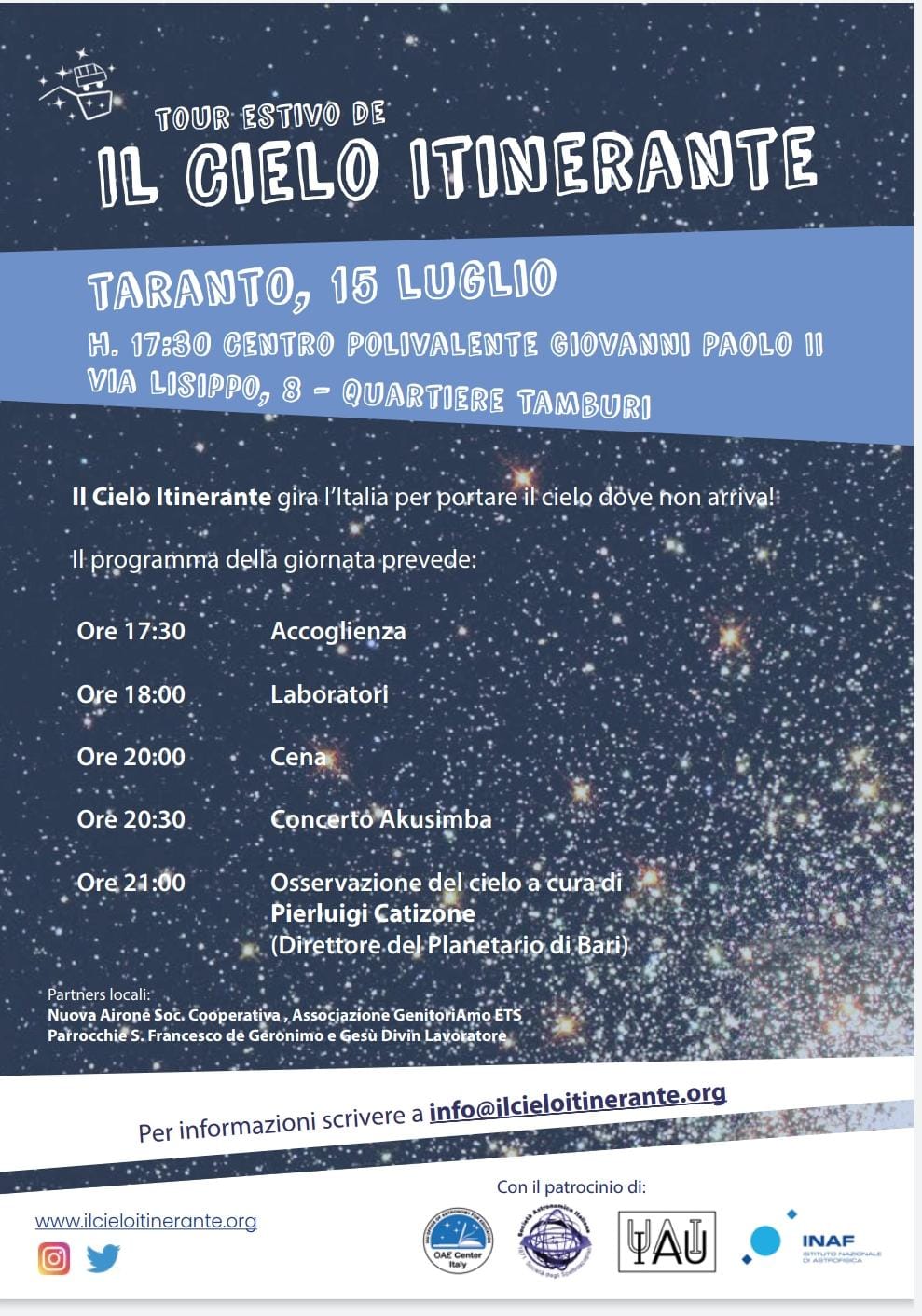 Il Cielo Itinerante fa tappa a Taranto giovedì 15 luglio, con il suo ricco programma di laboratori per bambini, iniziative artistiche e l’immancabile sessione di osservazione guidata del cielo.